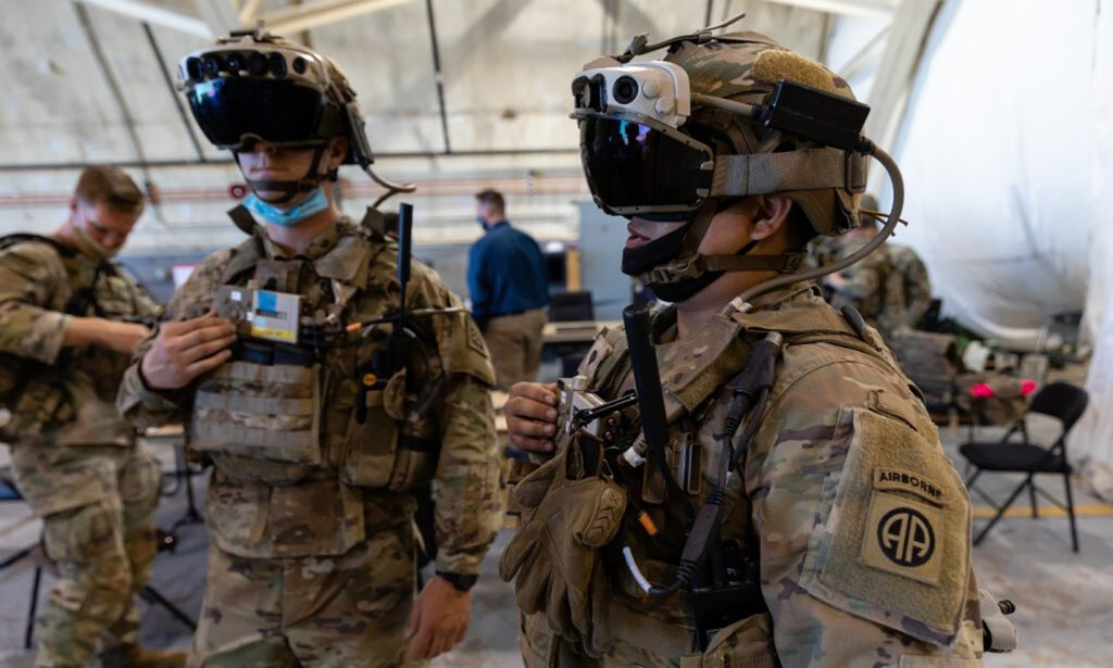 Two US Army soldiers wearing HoloLens-based military AR headsets.