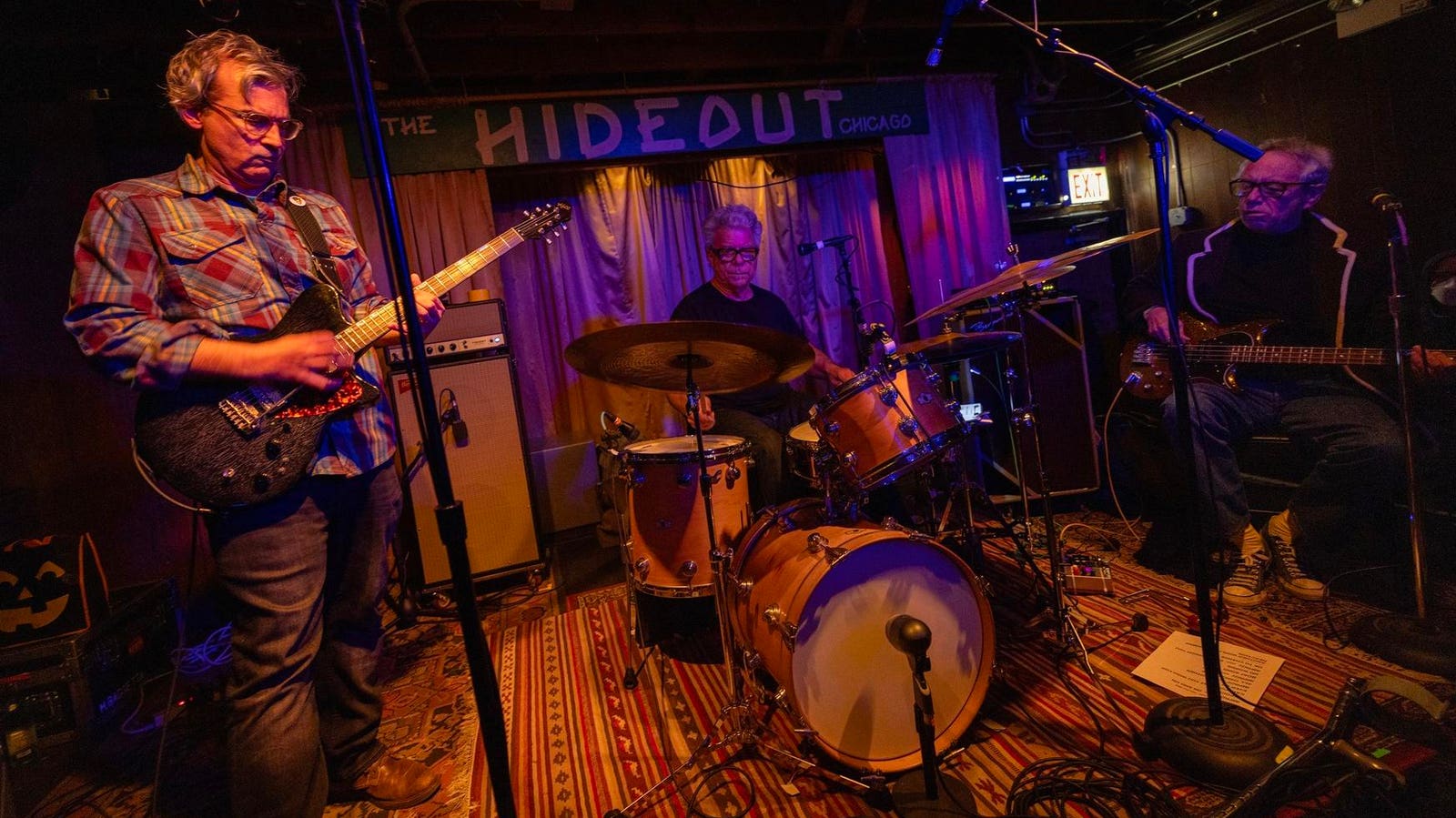 (Left to right) Mike Baggetta, Stephen Hodges and Mike Watt of mssv perform on stage at The Hideout. … More Wednesday, April 16, 2025 in Chicago, IL