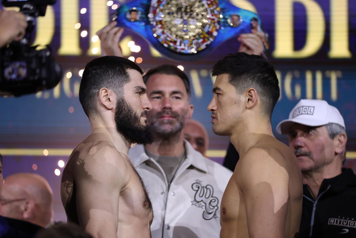 RIYADH, SAUDI ARABIA – FEBRUARY 21: Artur Beterbiev and Dmitrii Bivol face off during the weigh-in … [+] ahead of their IBF, WBO, WBC and IBO World Light Heavyweight title fight as part of Beterbiev v Bivol 2: The Last Crescendo at Boulevard Fountain on February 21, 2025 in Riyadh, Saudi Arabia. (Photo by Richard Pelham/Getty Images)