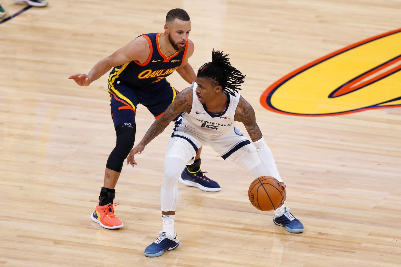 SAN FRANCISCO, CALIFORNIA – MAY 21: Ja Morant #12 of the Memphis Grizzlies is guarded by Stephen … More