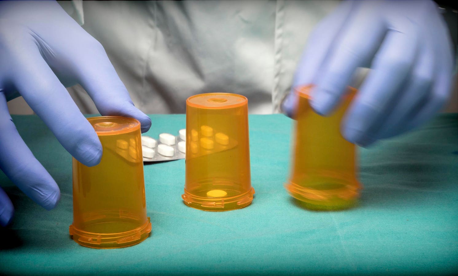 Doctor plays to Thimblerig with boats of medicine, conceptual image