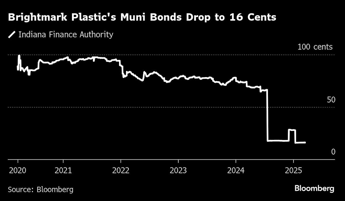 The filing came after Brightmark Plastics missed a roughly $13 million debt payment due March 1. The plant’s owner, San Francisco-based Brightmark Energy, had contributed more than $211 million in equity and determined it couldn’t keep investing in the project, according to a court filing. The company’s bonds last traded at about 16 cents on the dollar on Feb. 10. They were issued in March 2019.