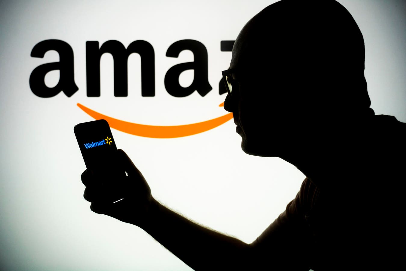 The Amazon and Walmart logos are seen on in this illustration photo in Warsaw, Poland on 17 August, … More 2023. A study by the IHL apparel group forecasts a USD 9.2 trillion economic impact on retailers with nearly half of that benefitting Amazaon and Walmart. (Photo by Jaap Arriens/NurPhoto via Getty Images)