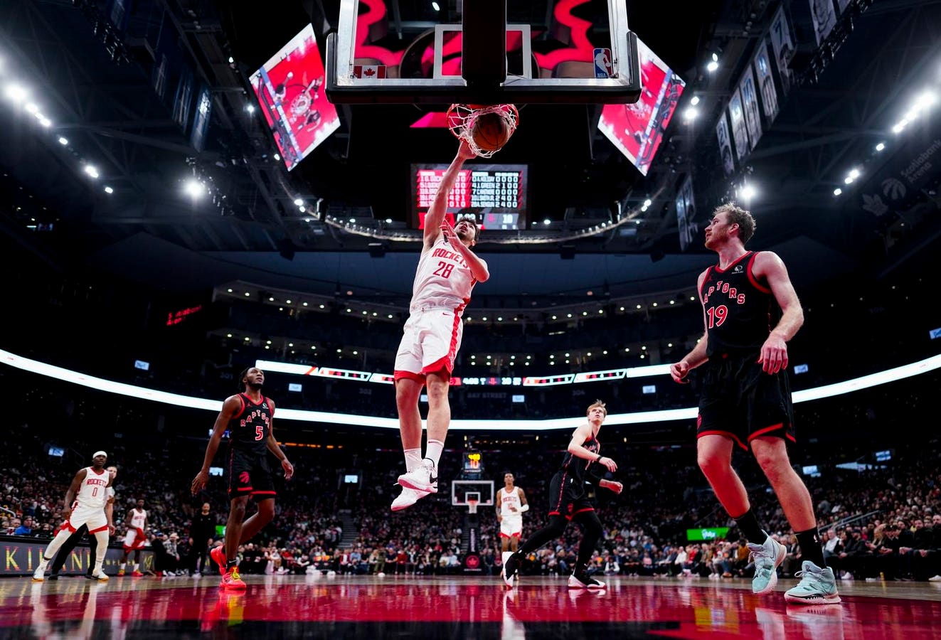 TORONTO, ON – FEBRUARY 9: Alperen Sengun #28 of the Houston Rockets goes to the basket against Jakob … [+]