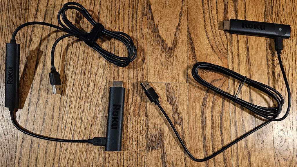 The Roku Streaming Stick Plus dongle and cable next to the Roku Streaming Stick 4K dongle and cable