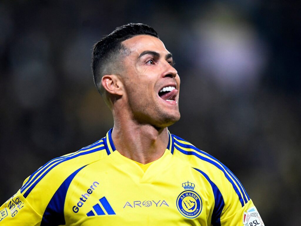 RIYADH, SAUDI ARABIA - FEBRUARY 7: Cristiano Ronaldo  of Al-Nassr FC celebrates scoring their third goal during the Saudi Pro League match between Al-Nassr and Al-Fayha at Al Awwal Park on February 7, 2025 in Riyadh, Saudi Arabia. (Photo by Abdullah Ahmed/Getty Images)