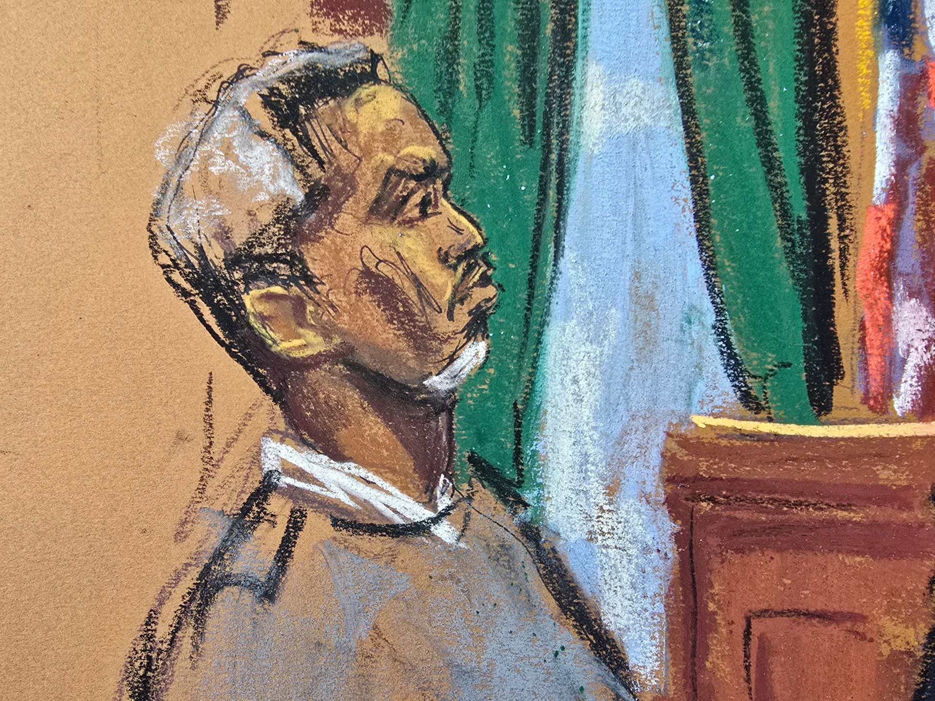 Courtroom sketches from Monday show Diddy with grey hair and a grey-beige sweater. His mother, Janice Combs, was also present in the courtroom.