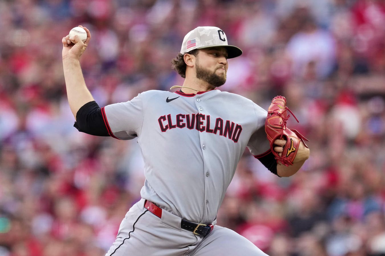 CINCINNATI, OHIO – MAY 17: Slade Cecconi #44 of the Cleveland Guardians pitches in the third inning … More