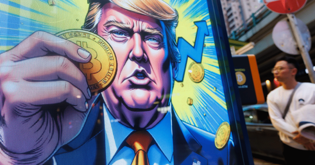 An advertisement in Hong Kong features an illustrated President Donald Trump holding bitcoin.May James/Zuma