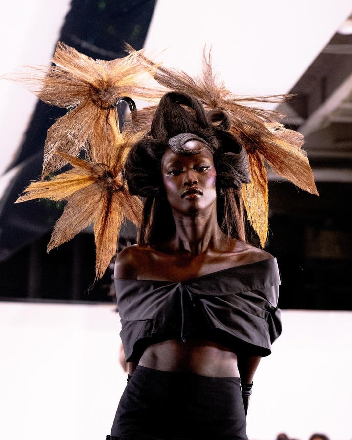 His collection, whether intentional or not, was a visual homage to ancestral African and Caribbean aesthetics, with natural materials and folkloric references woven into his designs. Hair sculpted into plant-like forms mimicked the shapes of early African American lemon grass baskets. Moss-like headpieces, sharp braided structures, and crocheted garments gave the illusion of organic textures growing from the models themselves—earthy, surreal, and alive. “In our role,” Marquez said, “the goal is always to help people tell their story. Between hair, makeup, and styling, there are a lot of voices in the room. It’s about building relationships, listening, and communicating, so the story can truly come through.”