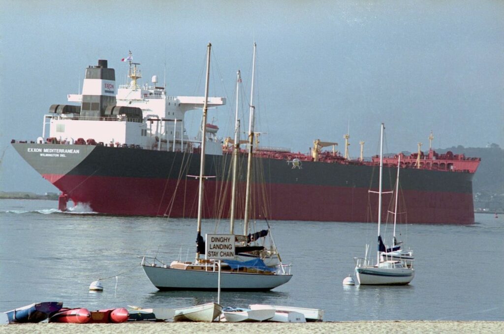 (Original Caption) San Diego: The 987-foot, 30,000-ton supertanker Exxon Mediterranean formerly the Exxon Valdez famous for its part in the largest oil spill in U. S. history 3/24/89 when it ran into Bligh Reef near Valdez, Alaska, dwarfs a few sailboats as it leaves San Diego Bay 8/29 under its own power for several days of sea tests after $30 million in repairs. This is the first venture back into the Pacific Ocean since limping into San Diego Bay for repairs 7/89.
