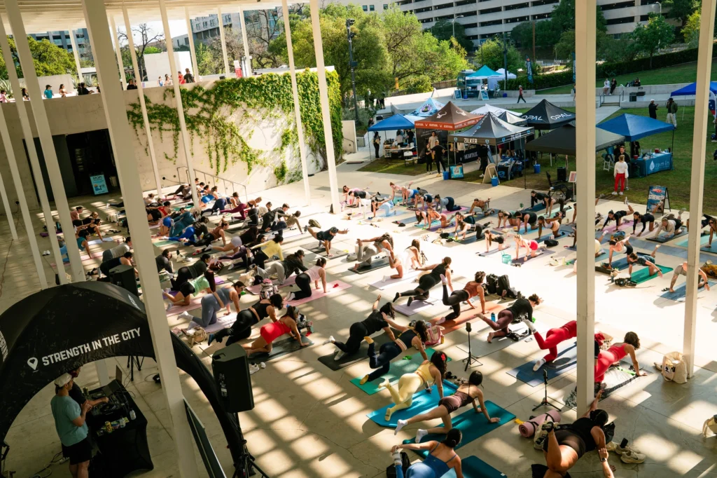 The event itself features a multi-stage format, with anywhere from 30 to 100 brand partners highlighting different modalities across fitness and wellness simultaneously, including strength training, cardio workouts, breathwork, yoga, soundbath meditations, community walks, and more.