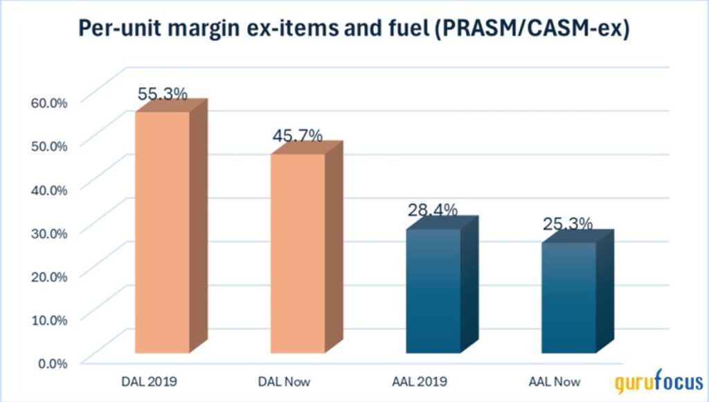 Even before COVID-19, Delta’s per-unit margin ex-items stood out at 55% vs. American’s meager 28%. To be fair to the latter, American managed to defend its profitability a little better through the pandemic, as the chart below shows.