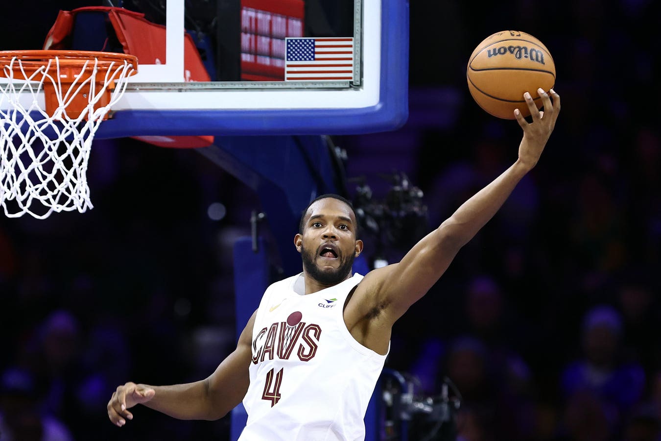 PHILADELPHIA, PENNSYLVANIA – FEBRUARY 23: Evan Mobley #4 of the Cleveland Cavaliers reaches for a … More