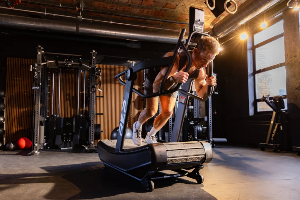While curved treadmills have become increasingly popular in performance-focused facilities, REP’s version pushes the concept further by integrating sled training directly into the machine.
