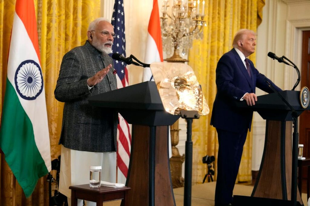 India’s Prime Minister Narendra Modi speaks as President Donald Trump listens during a news … [+]