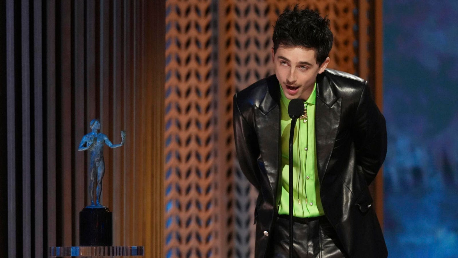 Timothee Chalamet accepts the award for outstanding performance by a male actor in a leading role … [+]