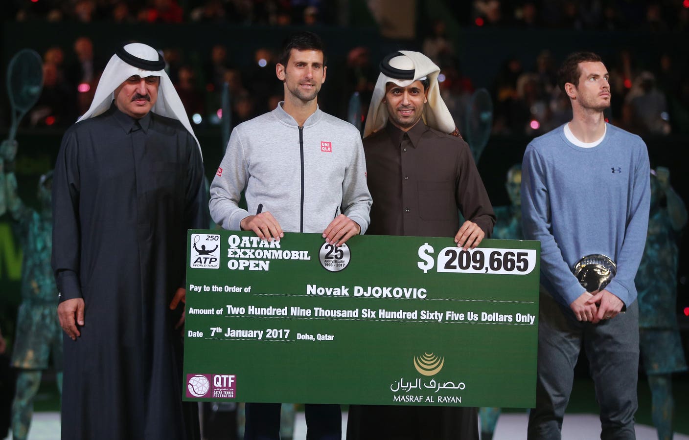 DOHA, QATAR – JANUARY 7: Novak Djokovic of Serbia receiving the prize money after winning the … More men’s singles Final Of ATP Qatar Open tennis competition against Andy Murray of Great Britain held at the Khalifa International Tennis Complex on January 7, 2017 in Doha, Qatar. (Photo by AK BijuRaj/Getty Images)
