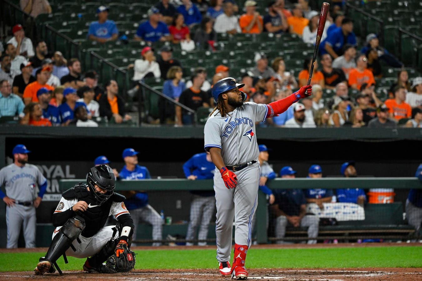 Toronto Blue Jays’ Vladimir Guerrero Jr. flies out to Baltimore Orioles center fielder Cedric … [+]