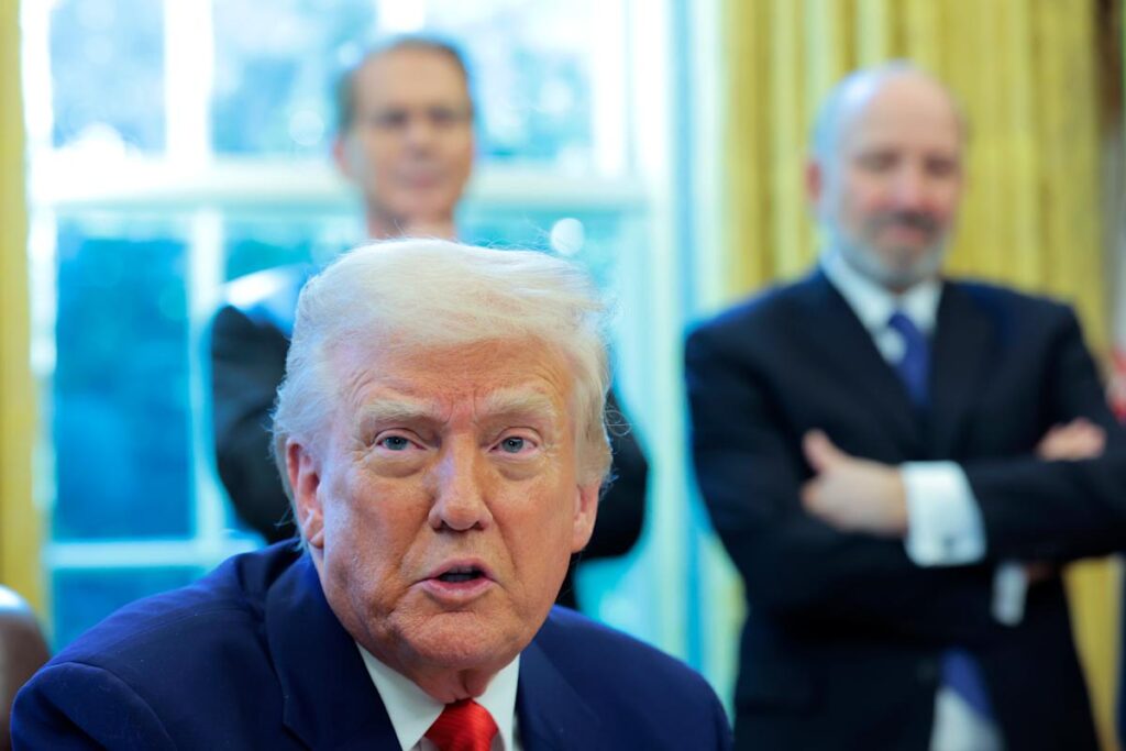 President Donald Trump speaks to reporters before Treasury Secretary Scott Bessent and Commerce Secretary Howard Lutnick in the Oval Office on April 9. (Anna Moneymaker/Getty Images) ·Anna Moneymaker via Getty Images