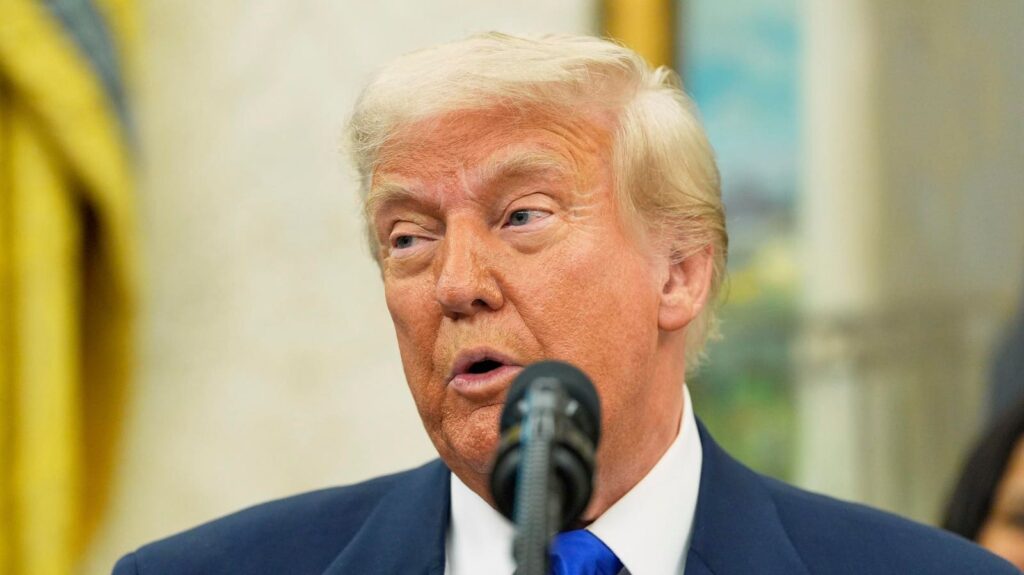 President Donald Trump speaks during an event to announce that the 2027 NFL Draft will be held on … More the National Mall, in the Oval Office of the White House, Monday, May 5, 2025, in Washington.
