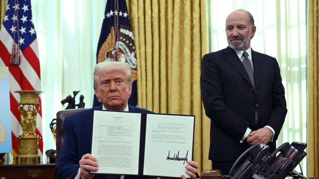 Donald Trump displays his signature on an executive order on reciprocal tariffs in the Oval Office … More