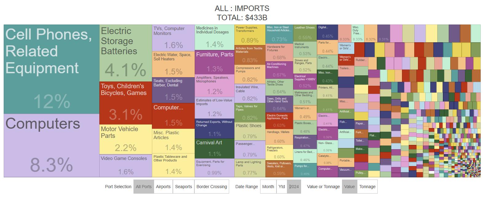 Just the top 15 imports from China in 2024 were valued at more than $190 billion, everything from cell phones to plastic tableware, video game consoles to furniture. China is either the first or second source for 12 of the 15. The 15 accounted for more than 43% of all imports from China last year – and the percentage from China has increased in eight so far this year.