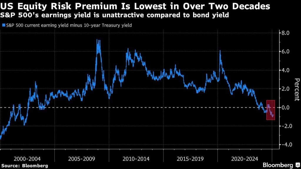 Positioning tells a similar story. The US equity risk premium (ERP) — a measure of the differential between the expected returns of stocks and bonds — is deep into negative territory, something that hasn’t happened since the early 2000s. Whether that’s a negative indicator for share prices depends on the economic cycle. A lower number can be seen as indicating that corporate profits are going to rise. Or it could mean that stocks are climbing too rapidly and are far above their actual value.