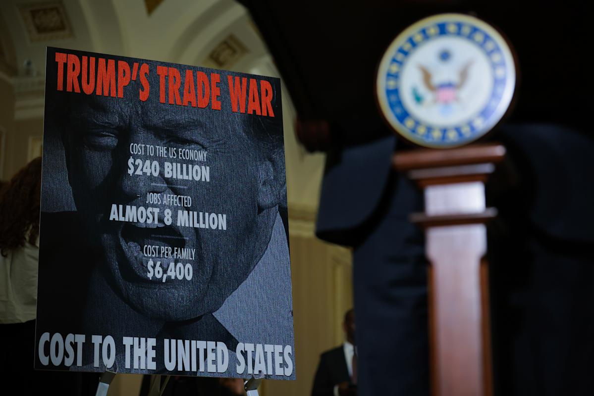 A sign on Trump’s trade war is seen behind behind Democratic Senator Tim Kaine at the U.S. Capitol on April 1. (Kayla Bartkowski/Getty Images) ·Kayla Bartkowski via Getty Images