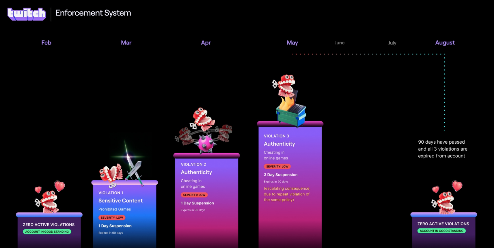 Twitch has rolled out a number of changes to its violation enforcement system. The biggest change is that now infractions will disappear from an account “after a set amount of time.” This is great news for long-time creators, as minor violations stacked. This led to folks getting suspended as these smaller infractions piled up.