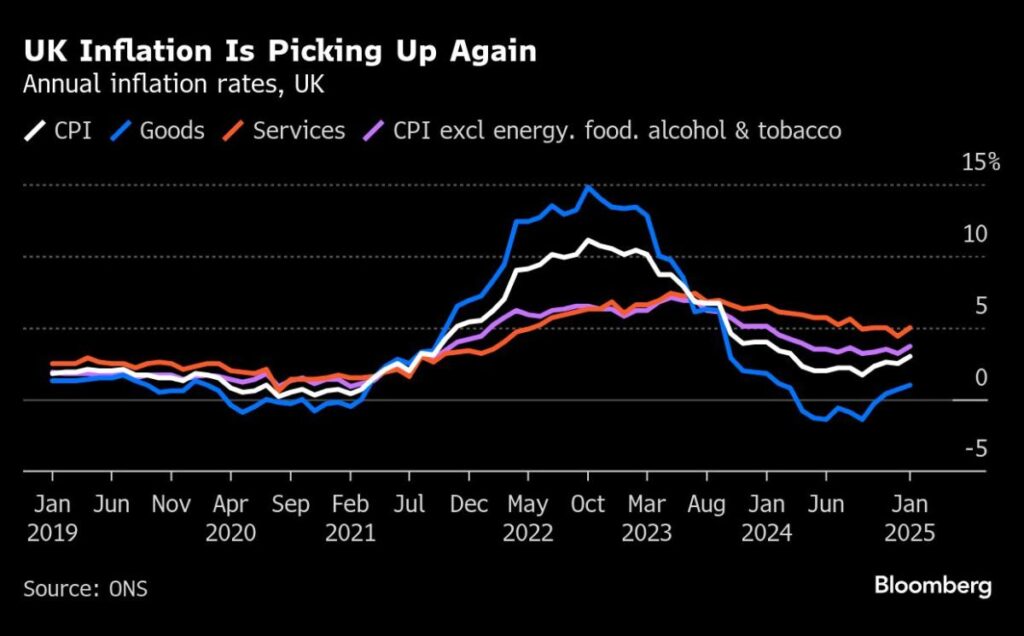 The figures, which follow resilient labor market data on Tuesday, support the BOE’s cautious approach to cutting interest rates to aid a moribund economy. While Governor Andrew Bailey has played down the threat from an expected surge in inflation this year, officials say they can’t rule out “second-round effects” keeping underlying pressures higher for longer. The BOE expects inflation to peak at 3.7% in the third quarter on the back of energy costs.