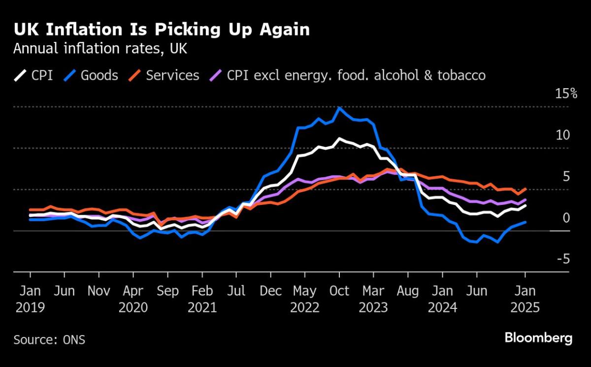 (Bloomberg) — UK inflation climbed to the highest level in 10 months in January, boosted by the cost of airfares, motor fuel, food and the imposition of value-added tax on private school fees.