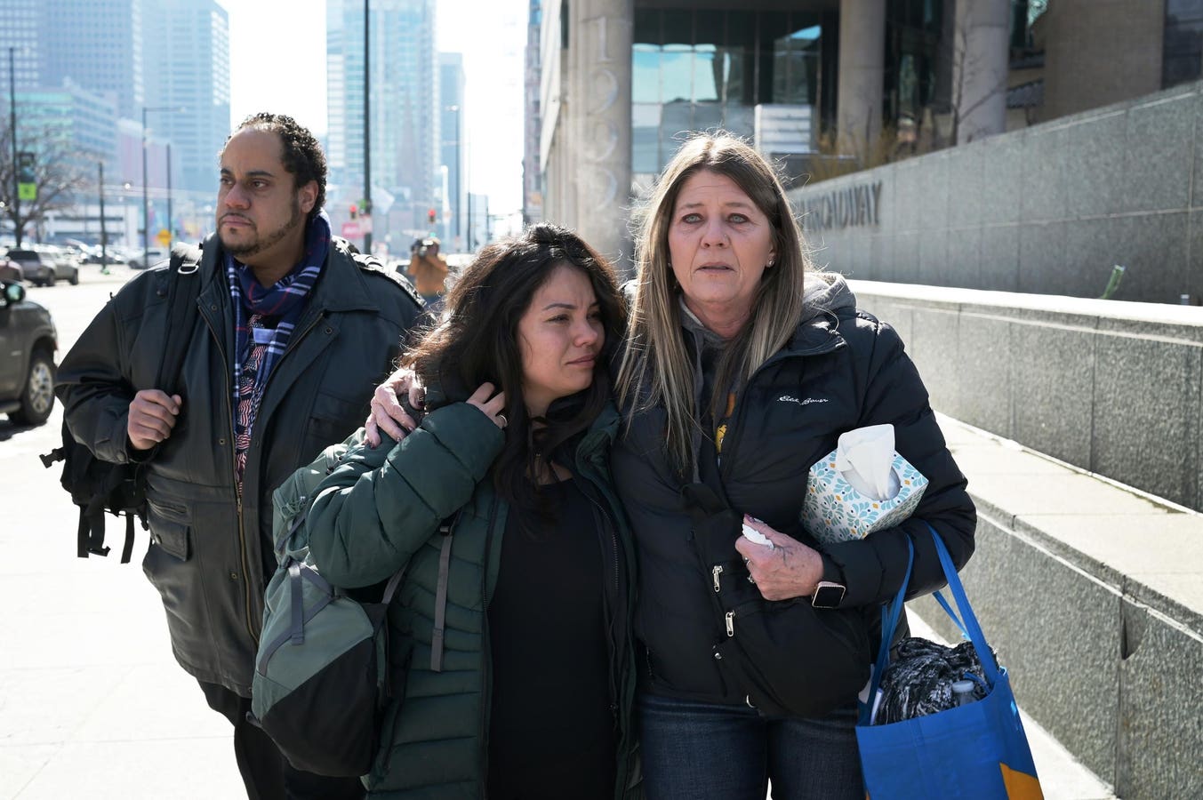 DENVER, CO – FEBRUARY 20 : From left, Donald McCorvey, Yvette Oseguera Torres, Jodie Malito, three former Internal Revenue Service workers leave their office after being laid off in downtown Denver, Colorado on Thursday, February 20, 2025. (Photo by Hyoung Chang/The Denver Post)