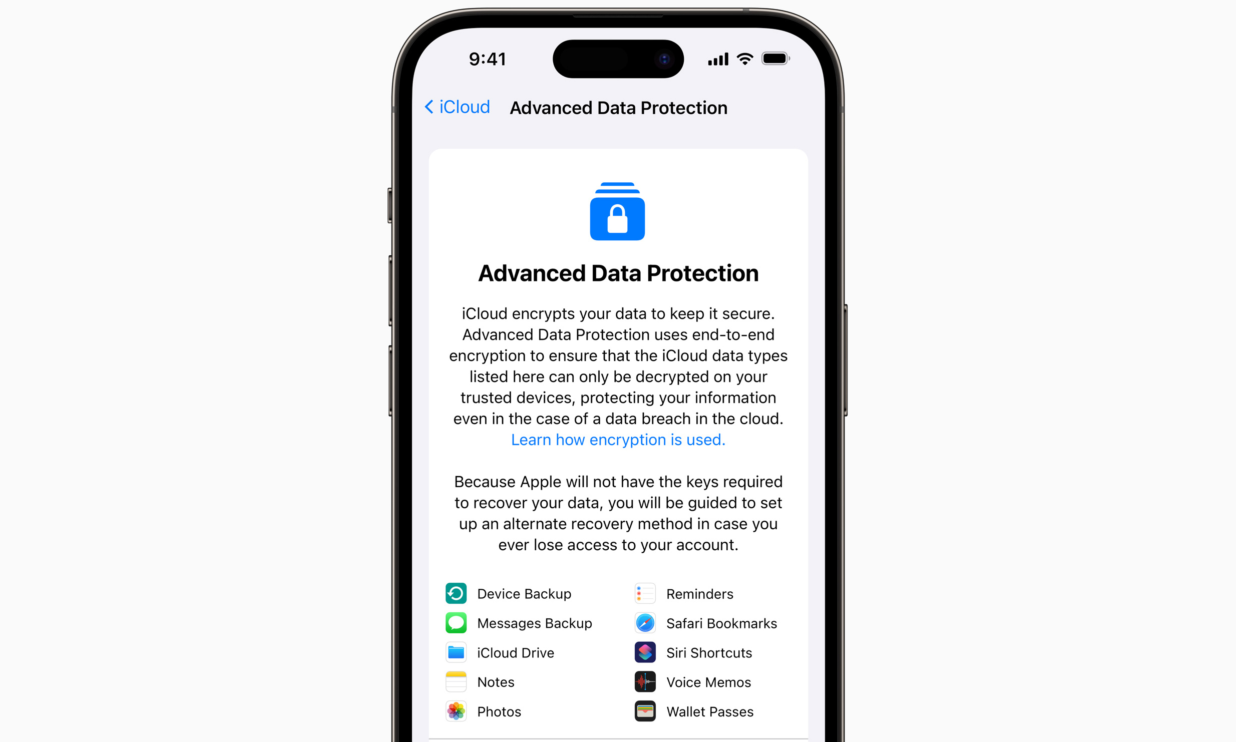 Screenshot showing setup for Apple’s Advanced Data Protection feature.