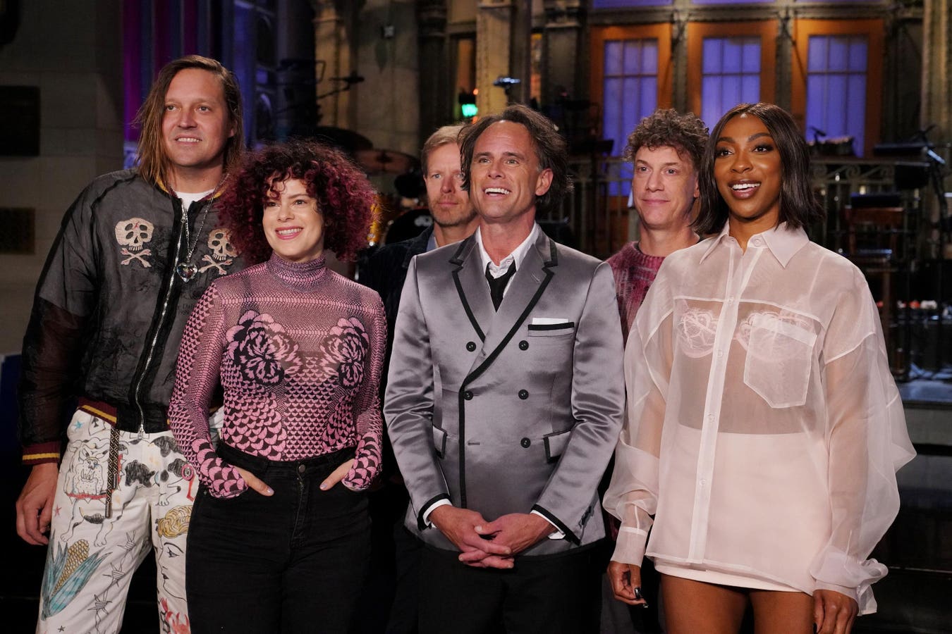 Musical guest Arcade Fire, host Walton Goggins, and Ego Nwodim during Promos in Studio 8H