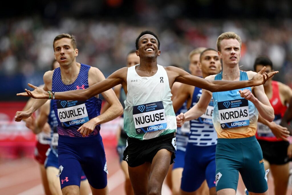 LONDON, ENGLAND – JULY 23: Yared Nuguse of Team United States celebrates after winning the Men’s … More 1500 Metres during the London Athletics Meet, part of the 2023 Diamond League series at London Stadium on July 23, 2023 in London, England. (Photo by Mike Hewitt/Getty Images)
