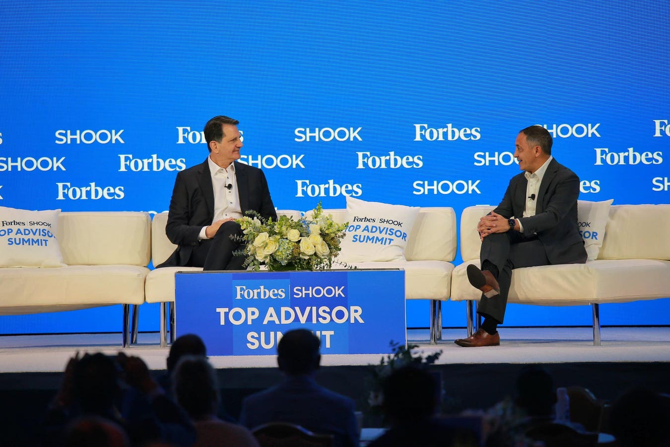 Lawrence Golub (left) speaks on stage at the Forbes/Shook Top Advisor Summit in Las Vegas.