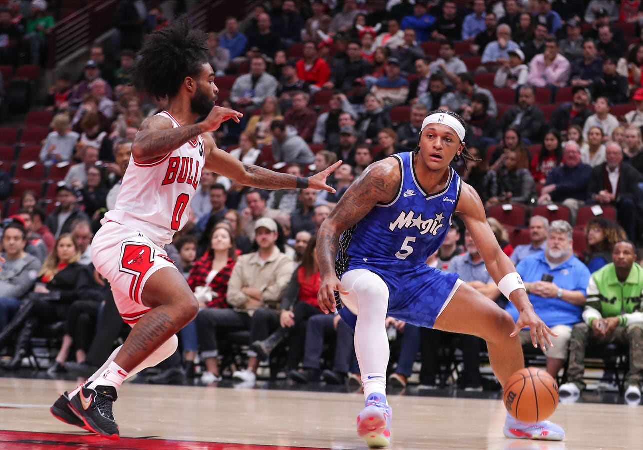 CHICAGO, IL – NOVEMBER 15: Chicago Bulls guard Coby White (0) guards Orlando Magic forward Paolo … [+]