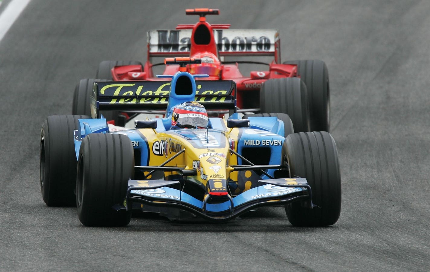 IMOLA, ITALY – APRIL 24: Fernando Alonso of Spain and Renault leads second placed Michael … More