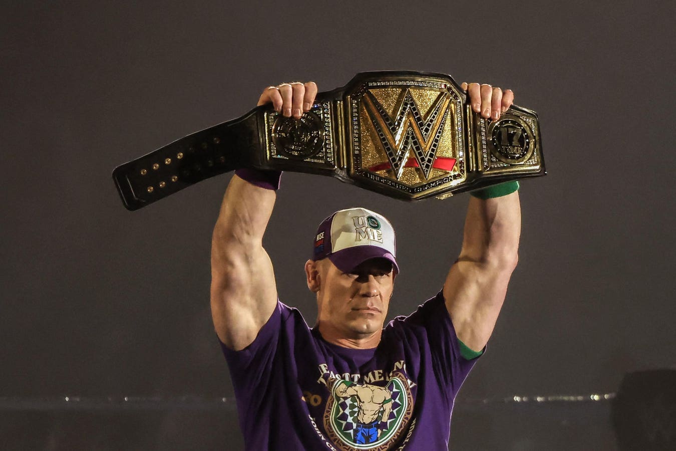 US wrestler John Cena holds his championship belt in the ring during a presentation on the eve of … More his match for the undisputed WWE Championship against CM Punk at Kingdom Arena in Riyadh on June 27, 2025. (Photo by Fayez Nureldine / AFP) (Photo by FAYEZ NURELDINE/AFP via Getty Images)