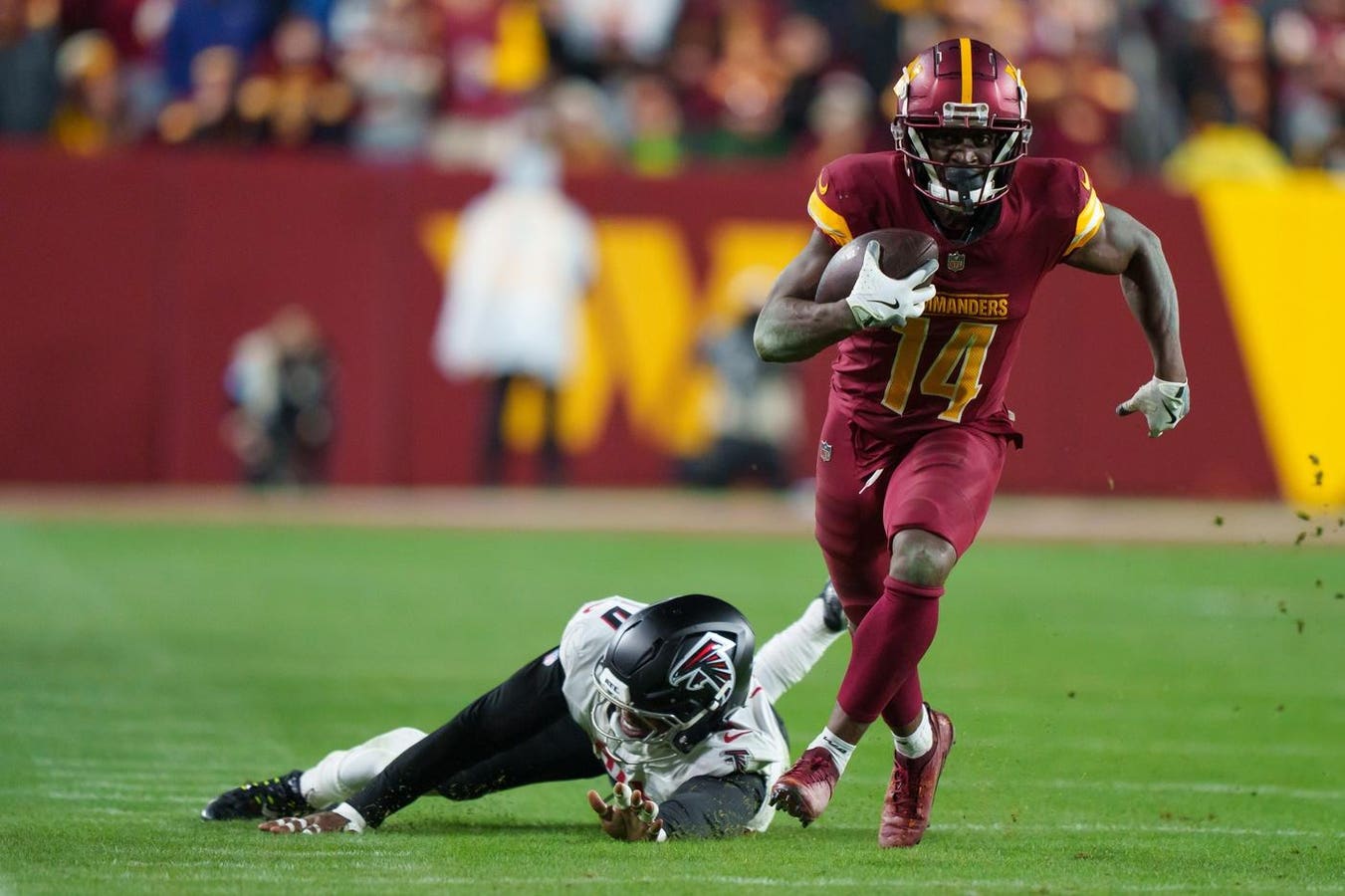 LANDOVER, MARYLAND – DECEMBER 29: Wide receiver Olamide Zaccheaus #14 of the Washington Commanders … More runs down the filed during the second half of an NFL football game against the Atlanta Falcons at Northwest Stadium on December 29, 2024 in Landover, Maryland. (Photo by Todd Rosenberg/Getty Images)